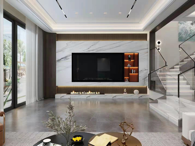 客厅空间采用落地窗设计,增进自然采光,背景墙以大理石与格栅搭配,尽显空间层次感,兼顾优雅格调与舒适氛围。