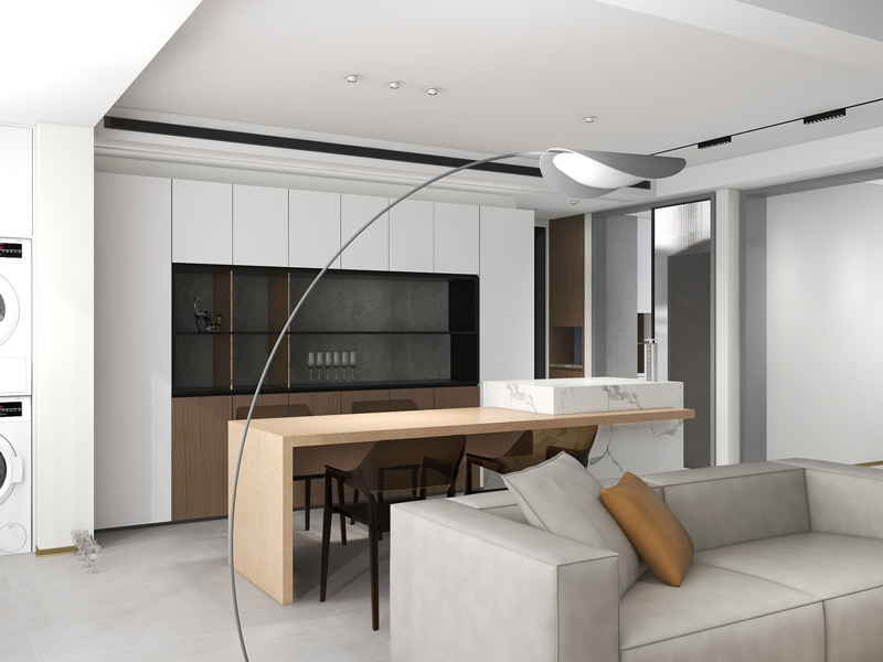 横厅的空间设计、餐客一体化的客厅布局,让整体视觉上更加饱满,实用的整面餐边柜设计保证空间的收纳需求。