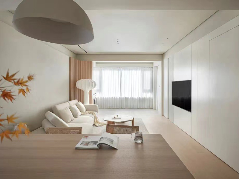 客厅整体以米白色为主,视觉更加纯粹整洁,木质的地板与细节处搭配轻松舒适,无主灯设计通透明朗。