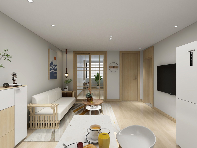本案例风格定位于简约原木风,由于空间的整体自然采光较差,在设计上多用浅色来提升亮度,避免阴暗。