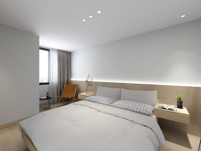 卧室背景墙采用木饰面搭配灯带设计,使原本简洁的背景墙更富有层次感,衬托出更立体的效果。