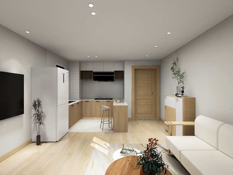 厨房将墙体打通,采用采用开放式厨房布局,视觉上放大空间,增加通透感,提升了空间的互动性。
