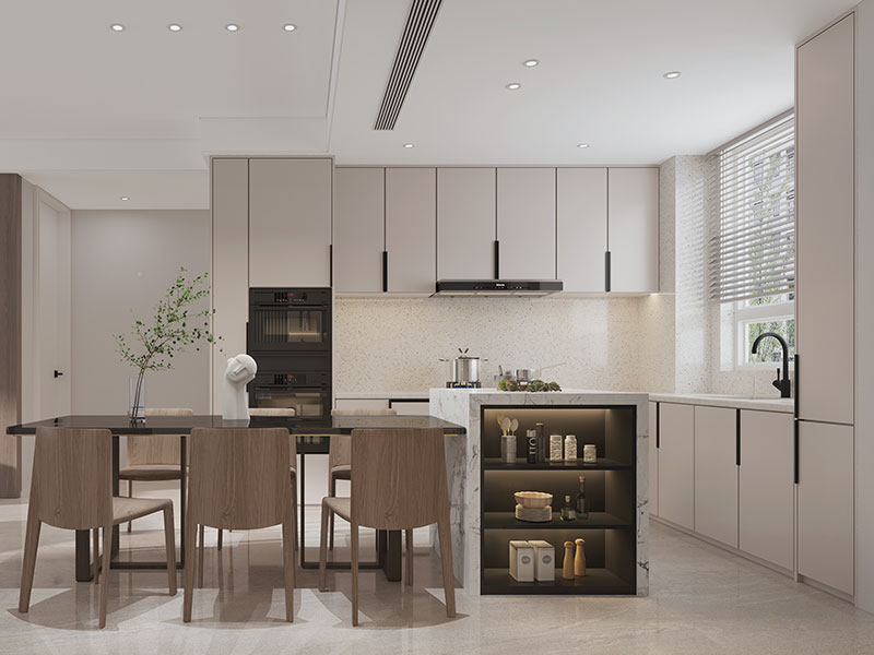 岛台底部可以设计收纳柜格,用来放置餐具、小型家电等,既能丰富空间的储物能力,又能彰显居室的整洁有序。