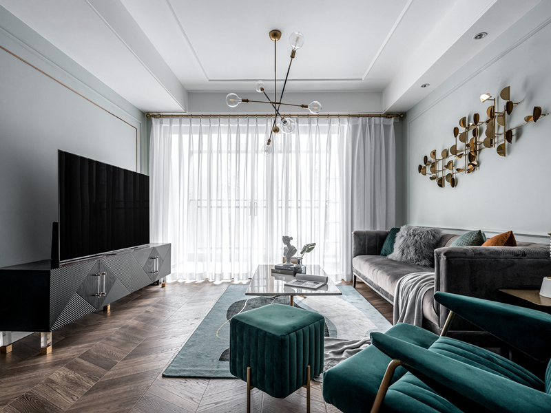 客厅多种材质的融入使空间视觉上非常丰富,精致的金属细节搭配自然温馨的木质地板,带给空间别样气质。