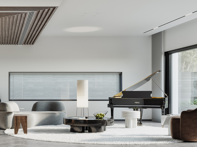 客厅空间没有采用传统的设计,使用钢琴与整体碰撞出优雅创意十足,整面落地窗保证整体采光需求。