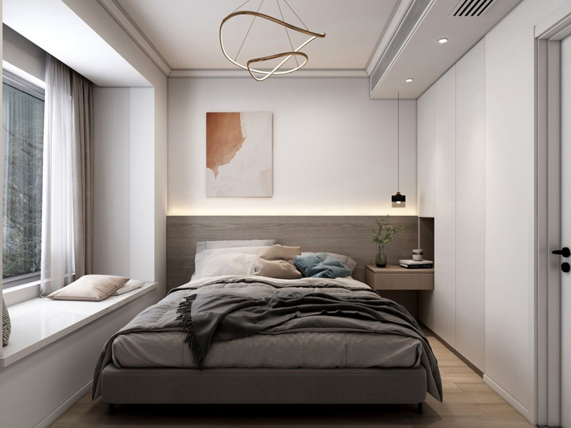 卧室面积有限,定制设计合理利用有限空间,背景墙搭配自然的木饰面,丰富空间层次,自然柔和。