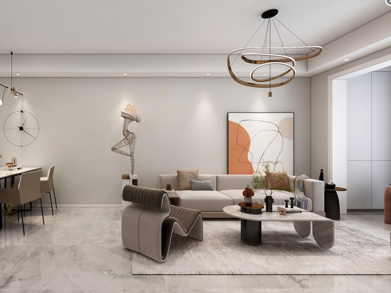 本案例风格定位于现代简约风,简洁的基础搭配创意装饰,让空间简洁的同时避免单调,营造舒适柔和的居所氛围。