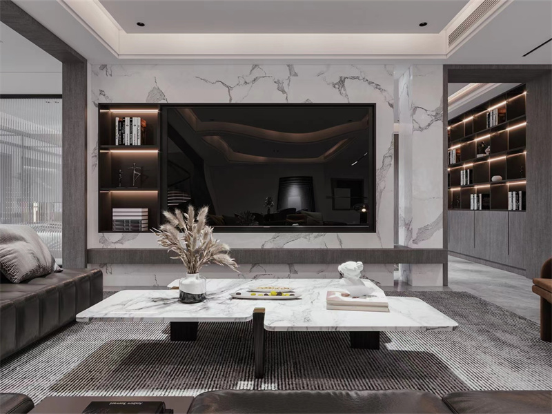客厅大理石电视墙搭配深色柜体,尽显空间格调,摆放书籍与装饰提升品位,兼顾美观与实用,营造出舒适又精致的居家氛围。