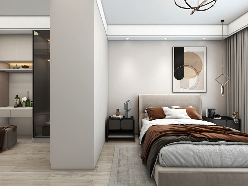 卧室区域采用隔断进行分区,分出睡眠区域与梳妆区域,动线合理且保证了睡眠质量,打造惬意的睡眠氛围。