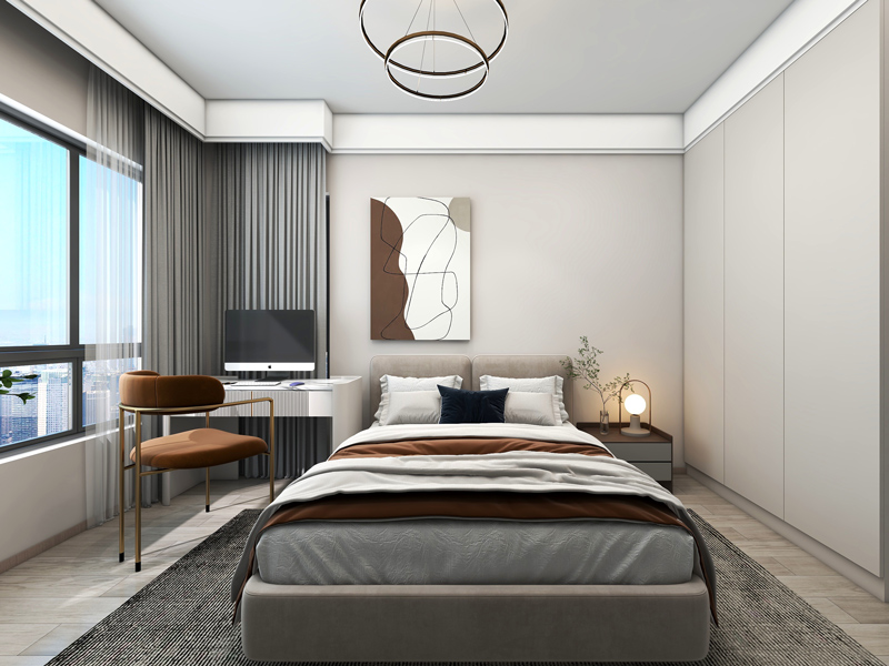 空间布局合理,增添书桌有序摆放,动线便捷满足办公需求,灰白基调搭配棕色点缀,沉稳又温馨,整体营造出舒适宁静的氛围。