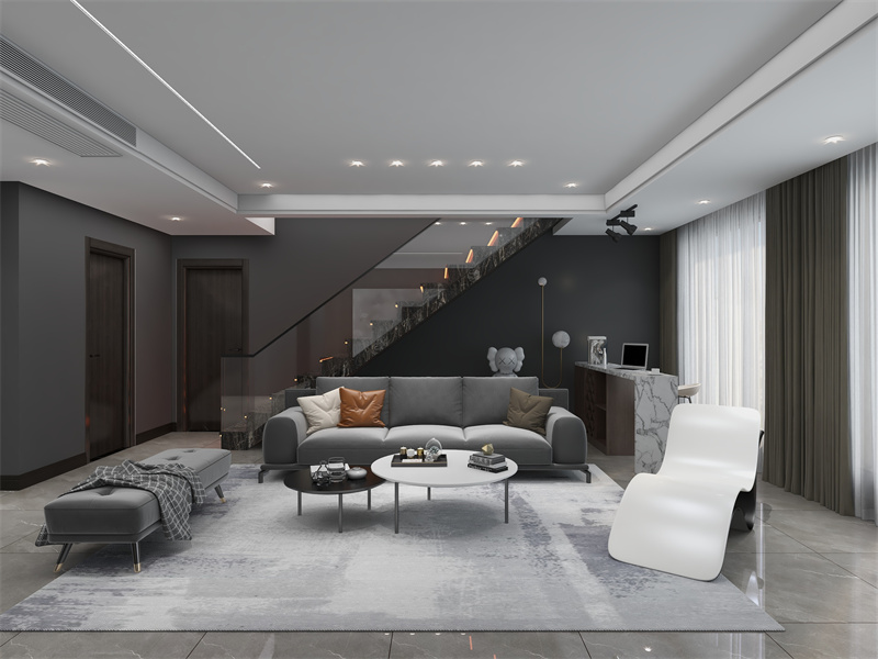 以灰色为主调,营造沉稳现代氛围。电视墙的仿水泥纹理与嵌入式壁炉,增添工业风质感。弧形休闲椅、圆形茶几打破直线硬朗,适配社交与独处,在理性秩序里藏生活温度,诠释现代简约的松弛感。