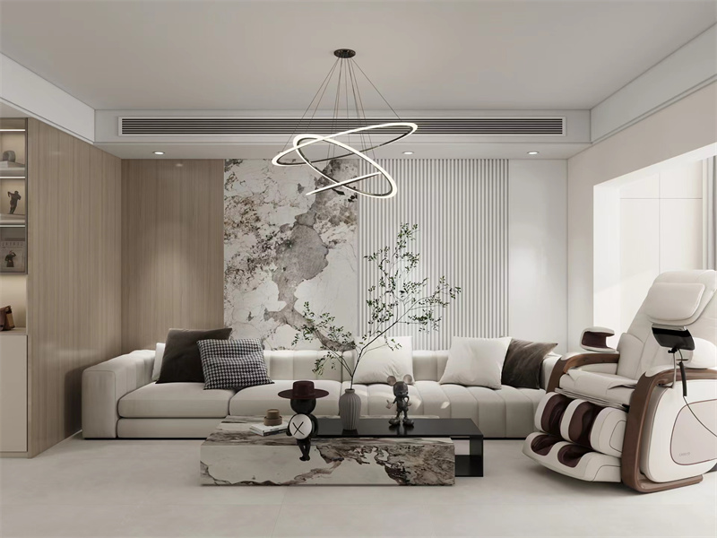 以现代简约为基底,木饰面与石材背景墙形成材质对话,环形艺术吊灯成为视觉焦点。浅色系沙发搭配多元抱枕,兼顾舒适与设计感,按摩椅的加入提升功能属性。